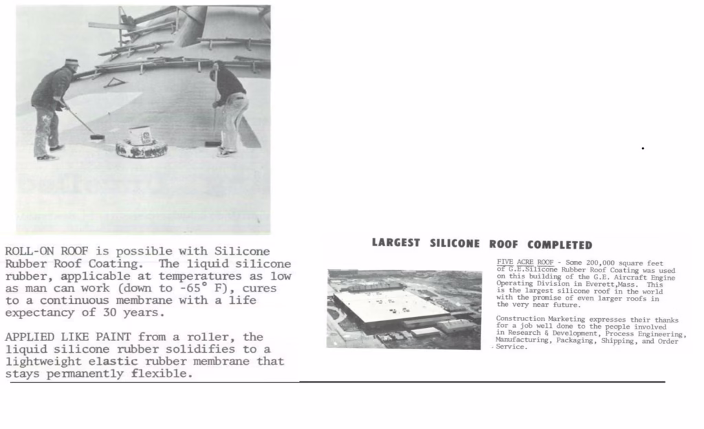 A GE apresentou formalmente a primeira Membrana de Silicone para Telhado em uma conferência de imprensa em maio de 1967 no hotel Waldorf Astoria em Nova York. Essa primeira geração  de membranas para telhados foi simplesmente chamada de “Revestimento de Borracha de Silicone para Telhados”, também conhecido como SRRC (Silicone Rubber Roof Coating).  A adoção comercial veio rapidamente e, no final de 1968, a instalação do Grupo de Motores de Aeronaves de 20.000 metros quadrados da GE em Everett MA foi o maior telhado conhecido a ser envelopado até então. A borracha de silicone proporciona a flexibilidade e elasticidade da borracha de base orgânica, mas também resiste à quebra por luz UV, calor ou frio.  (Veja no  YouTube “The Answer GE Silicones 1973” vídeo de publicidade retrô – https://www.youtube.com/watch?v=LsUcQTv2Qj8 )